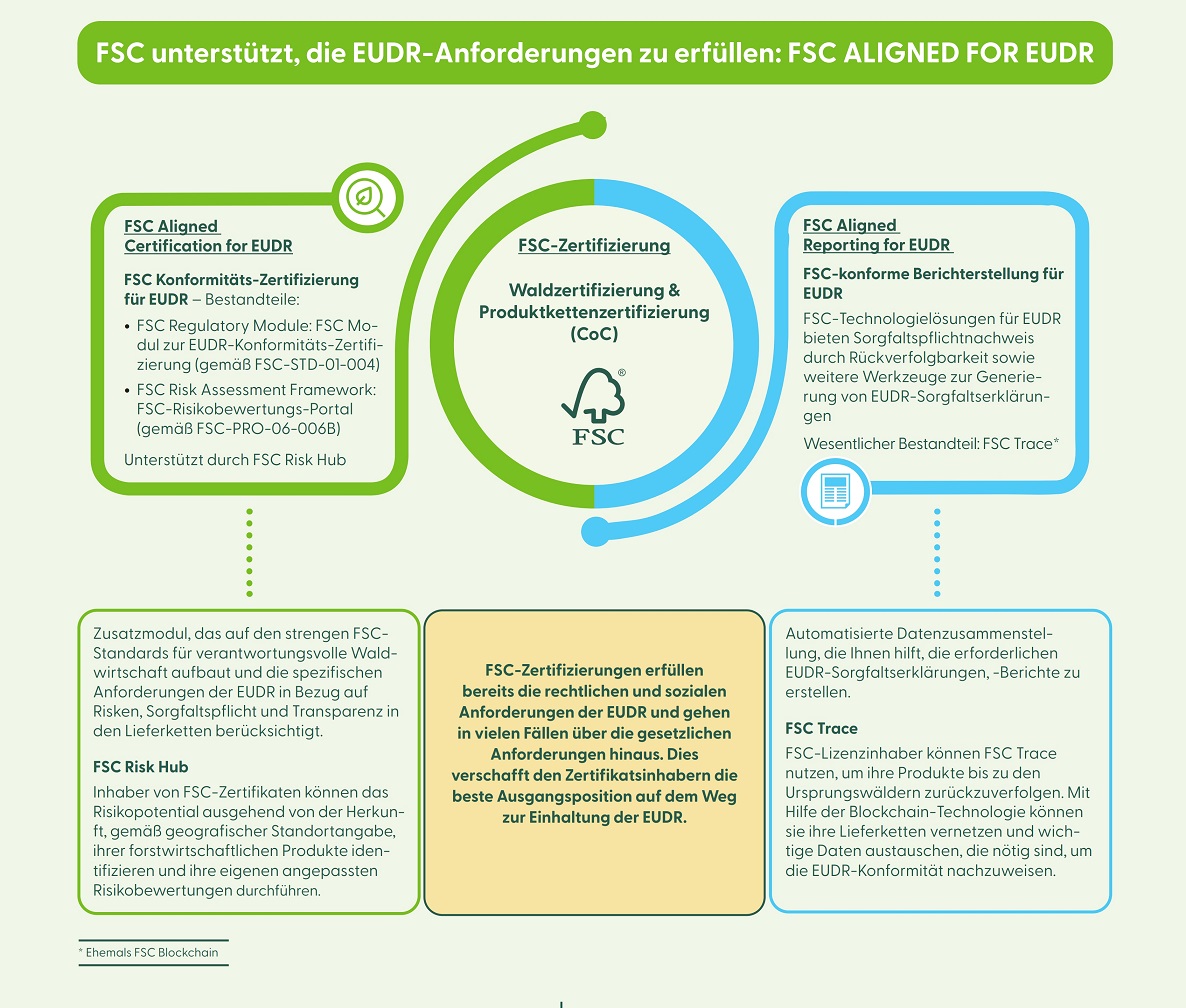 FSC Aligned Certification for EUDR: FSC Aligned Certification for EUDR ist das freiwillige Zusatzmodul für Anforderungen der EUDR in Bezug auf Risiken, Sorgfaltspflicht und Transparenz.